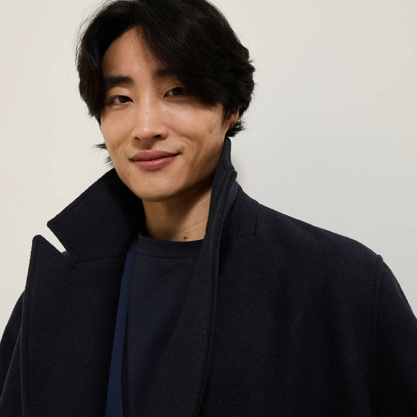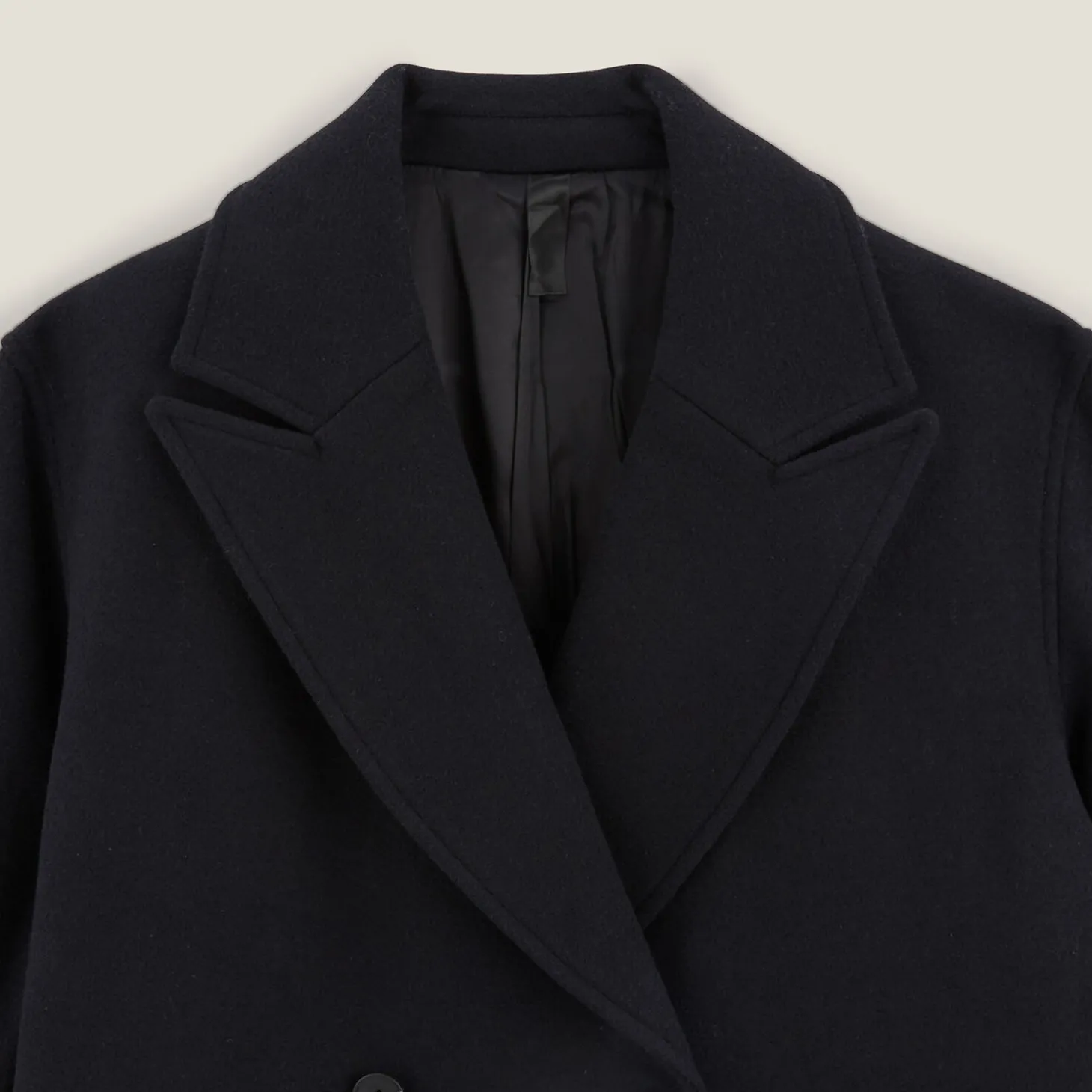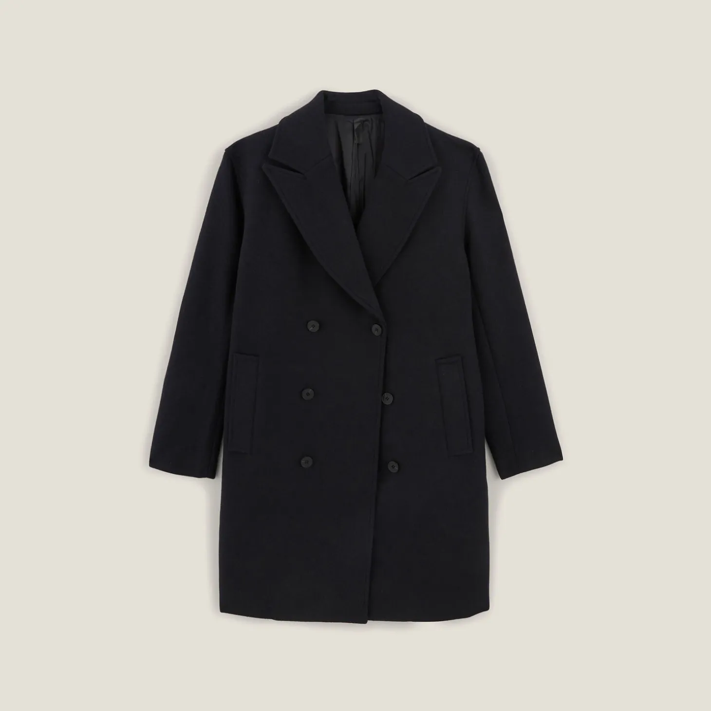 Deze lange wollen jas met dubbele knoopsluiting is ideaal om stijlvol de winter in te gaan. De reverskraag en rechte snit geven u een elegante en tijdloze allure.