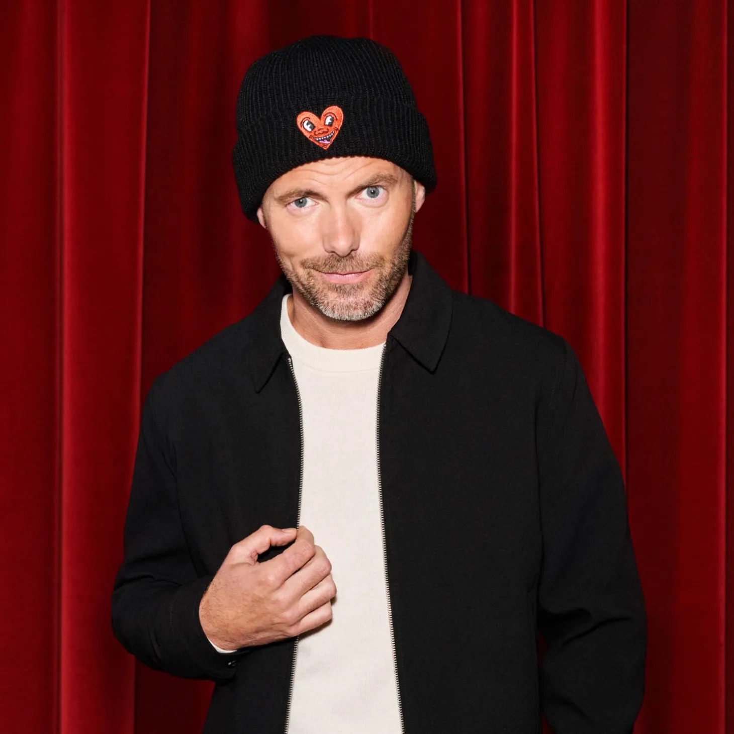 Geef je look een artistieke touch met deze muts onder Keith Haring-licentie. Dit model in ribtricot wordt verfraaid met een geborduurde patch in hartenvorm op de voorkant.