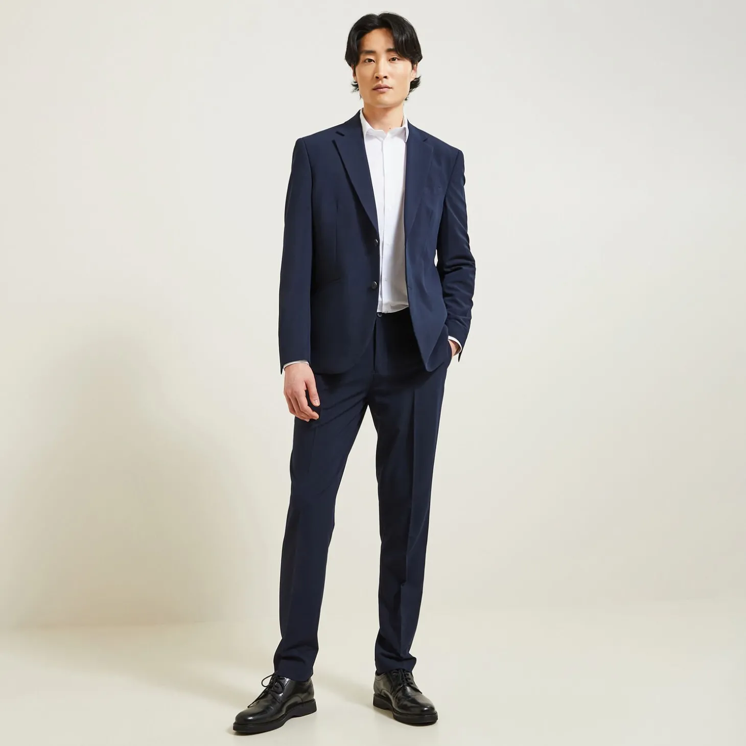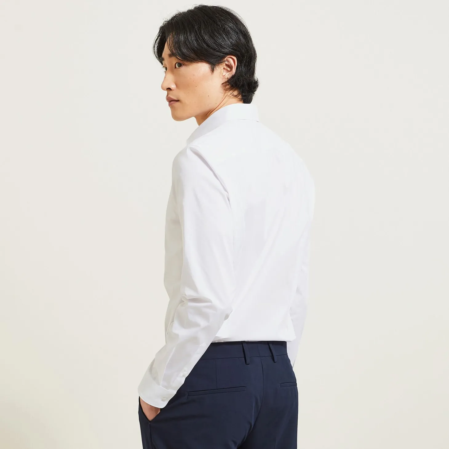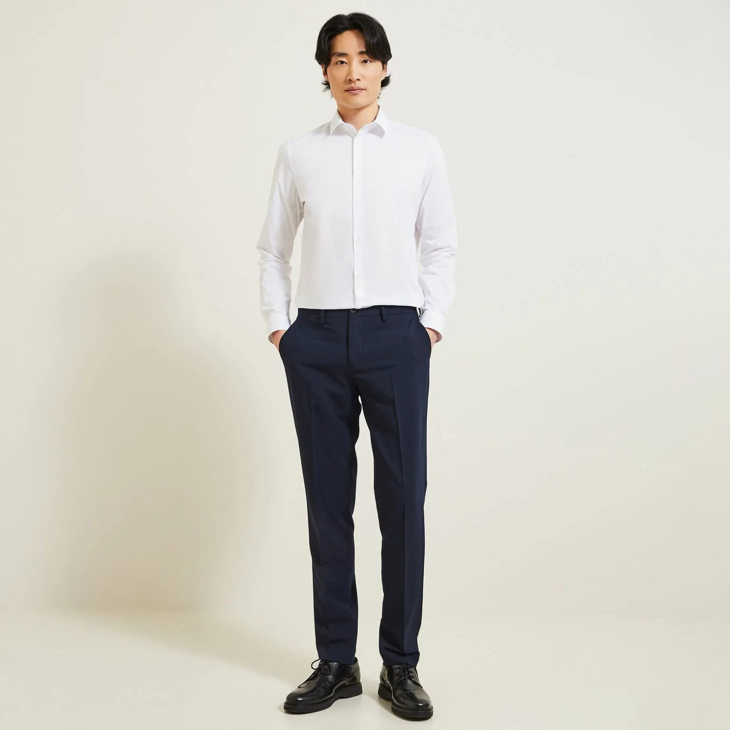 Dit hemd met lange mouwen past prima op een chino of kostuumbroek.