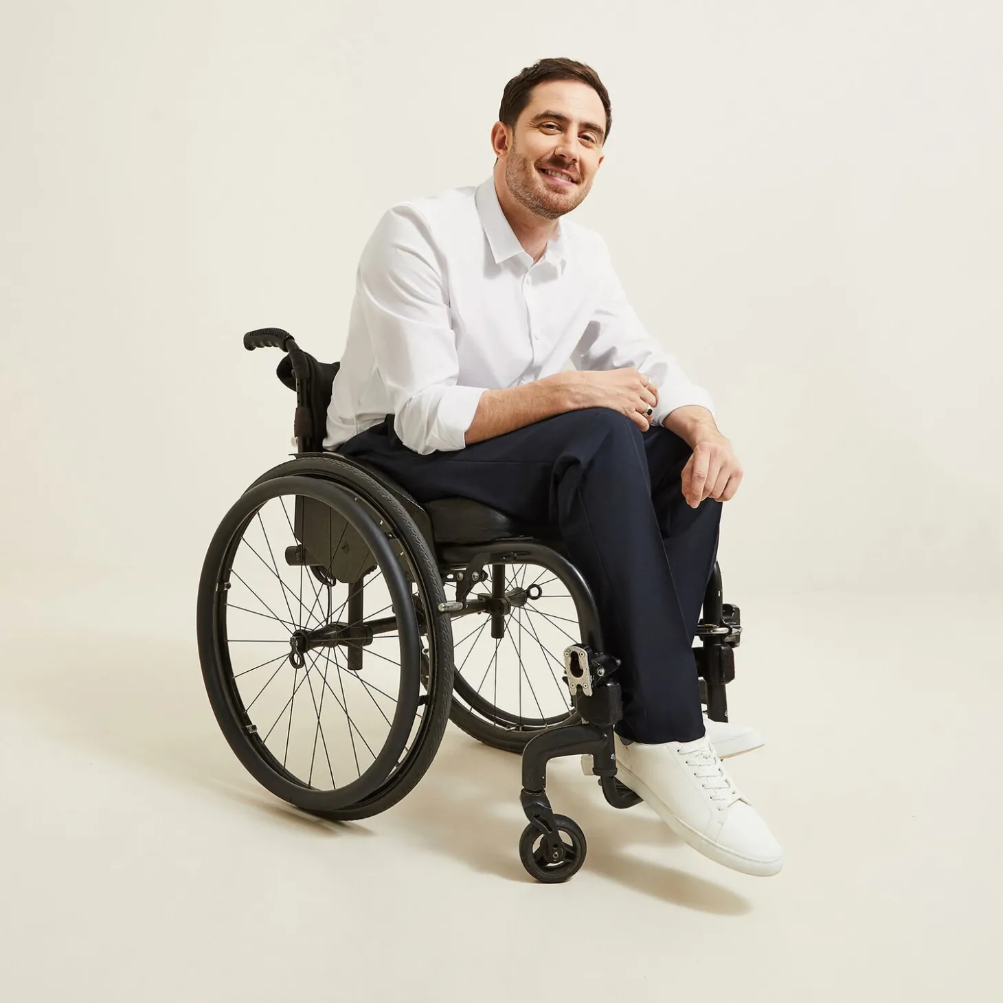 Deze kostuumbroek is speciaal ontworpen voor personen met beperkte mobiliteit.
