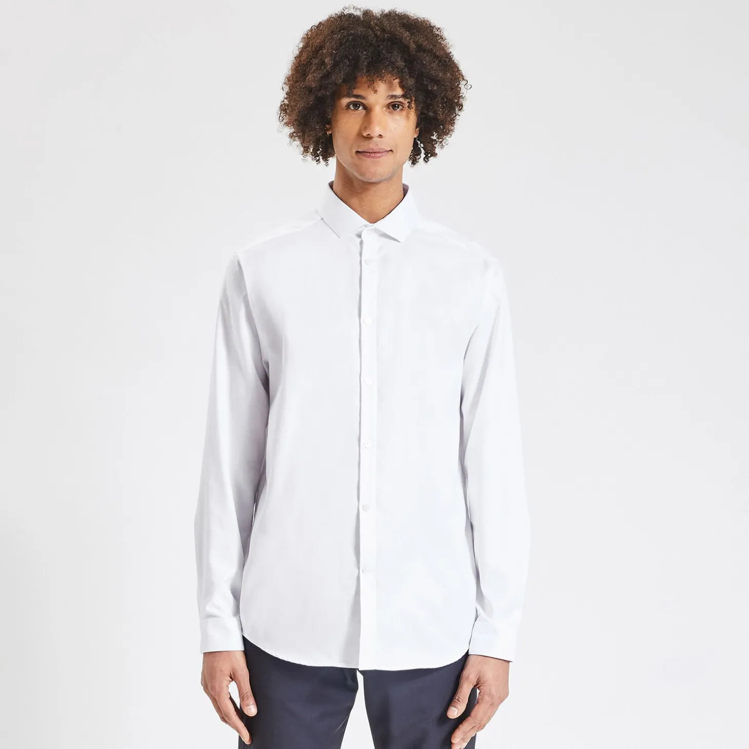 Om je hemden na het wassen niet te hoeven strijken, hebben we een stof ontwikkeld voorzien van een kreukvrije behandeling die strijken overbodig maakt.Het model meet 1m86 en draagt maat L.