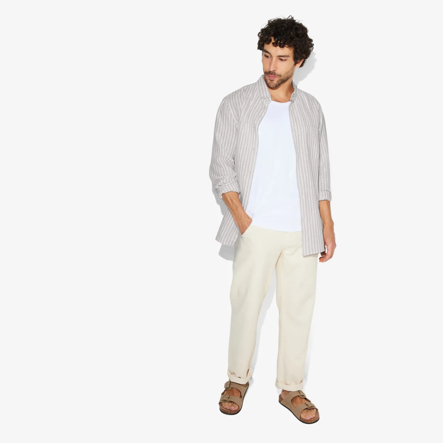 Linnen is een natuurlijke stof, omdat vlasteelt geen chemicaliën en 65% minder water vereist ten opzichte van katoenteelt. Het heeft thermoregulerende eigenschappen en is bovendien zeer sterk.Het model meet 1m86 en draagt maat L.