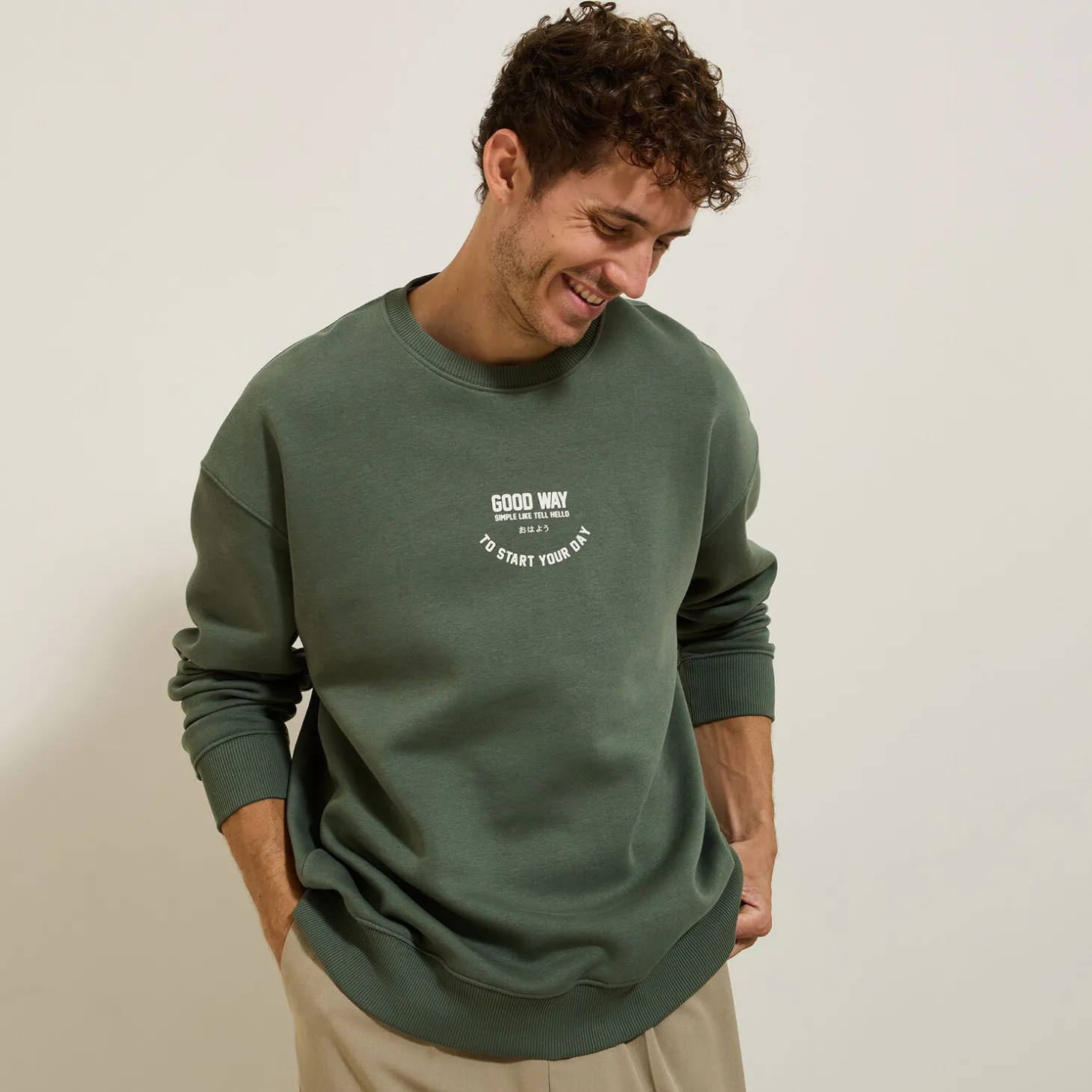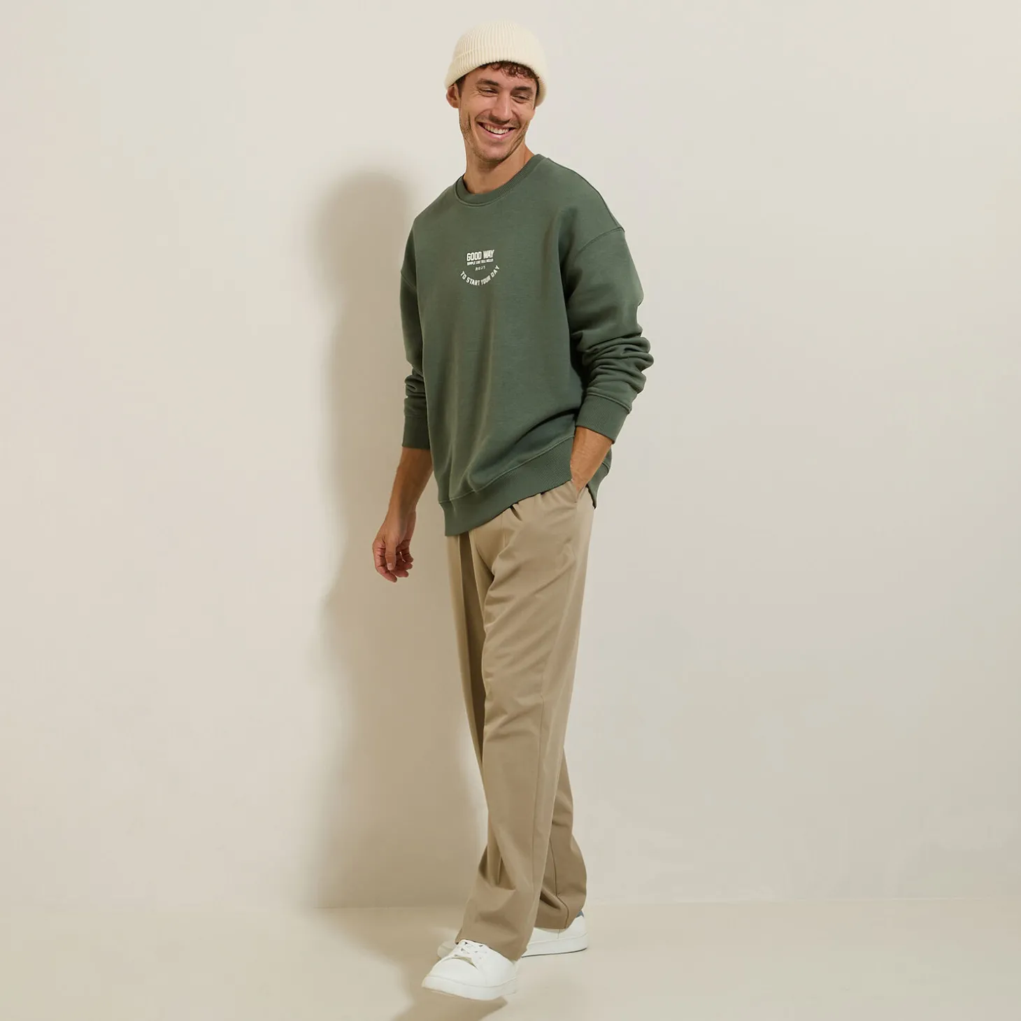 Deze sweater met originele print past perfect bij een lichtkleurige chinobroek voor een relaxte en trendy look. Maak de outfit compleet met een paar witte sneakers voor een urban en comfortabele look.
