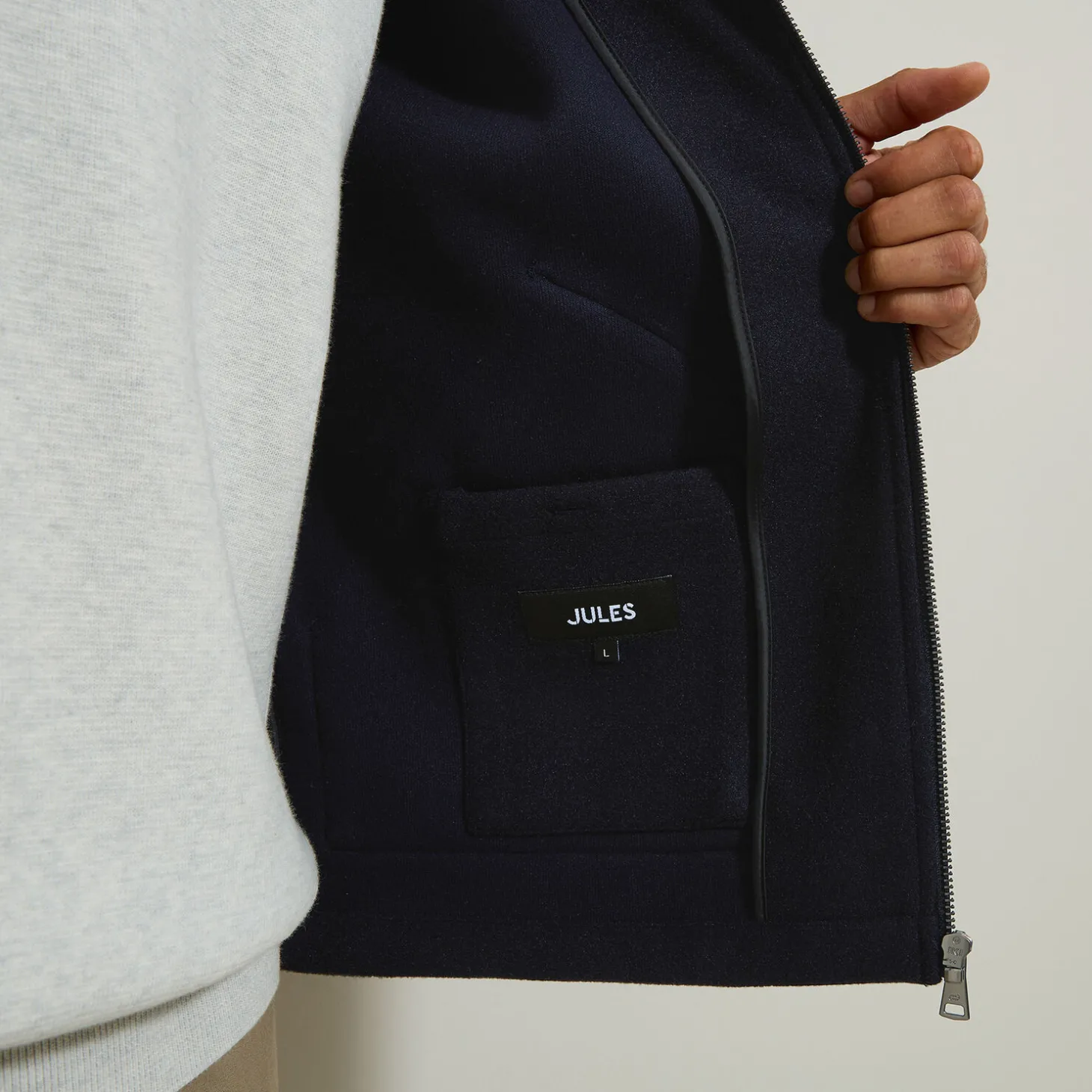 - 2 zakken vooraan + 1 binnenzak met knoop