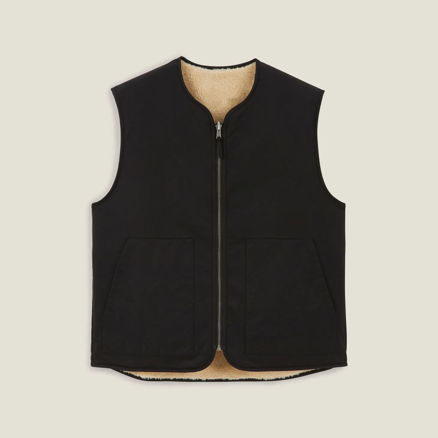Dit omkeerbare mouwloze jasje op een trui of sweater maakt uw outfit helemaal af.