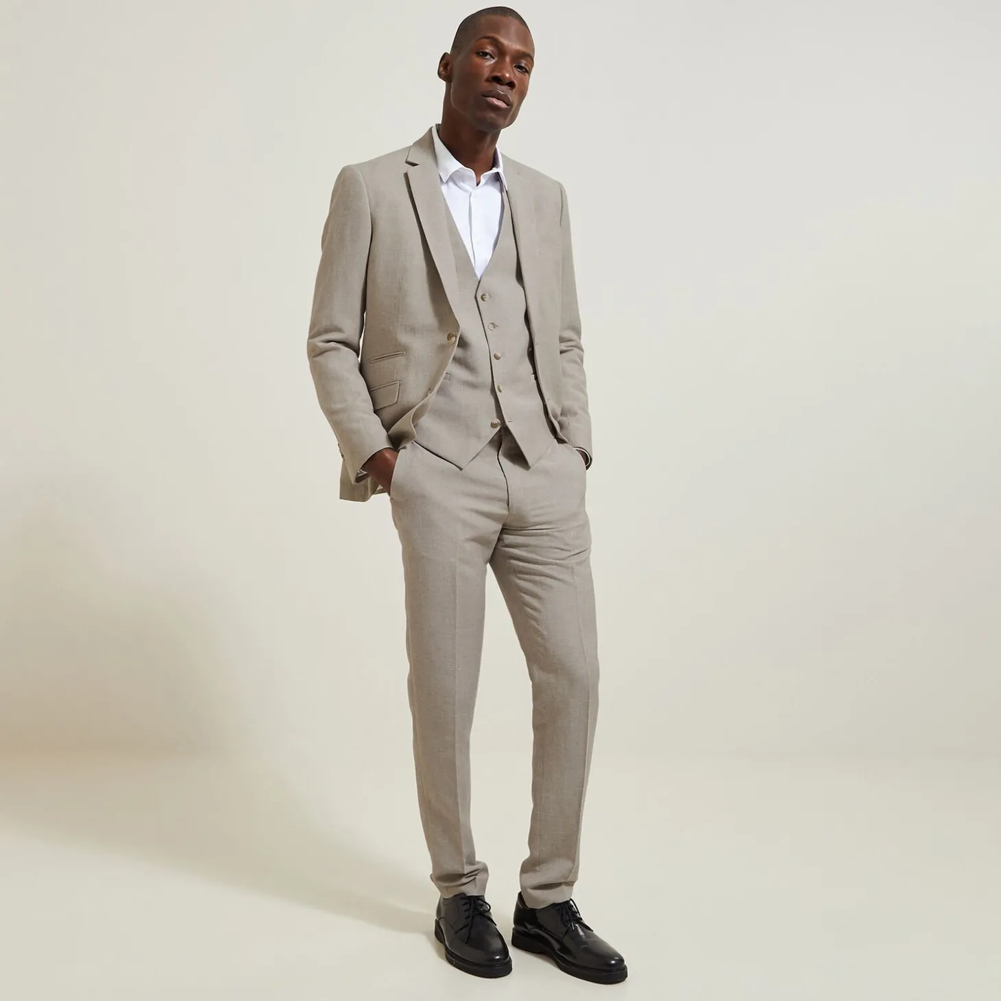 Uitgevoerd in een zeer mooi weefsel met 57% linnen, dit kostuumgilet kan je dragen met of zonder kostuumvest, voor een classy touch wat je look ook is.