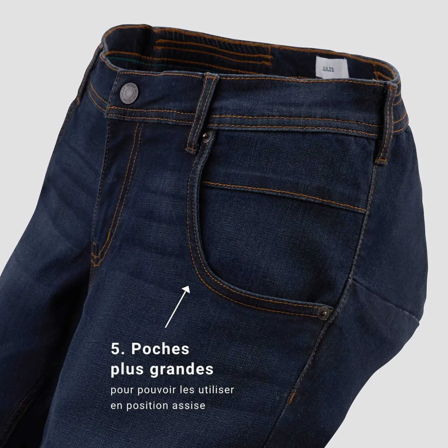 Deze jeans is zeer elastisch voor een maximaal draagcomfort en een minimum aan schuren, ongemak en letsels.Romain meet 1,64 m en draagt maat 38. 1. Langere gulp om makkelijker aan te trekken 2. Sierknop met haakje om makkelijker te hanteren en te sluiten 3. Plooien op het rugpand en op de dijen zodat de tailleband van de broek goed op zijn plaats blijft bij het zitten 4. Op het rugpand: geen zakken noch lussen om ongemak en letsels te voorkomen 5. Grotere zakken om ze te kunnen gebruiken bij het zitten