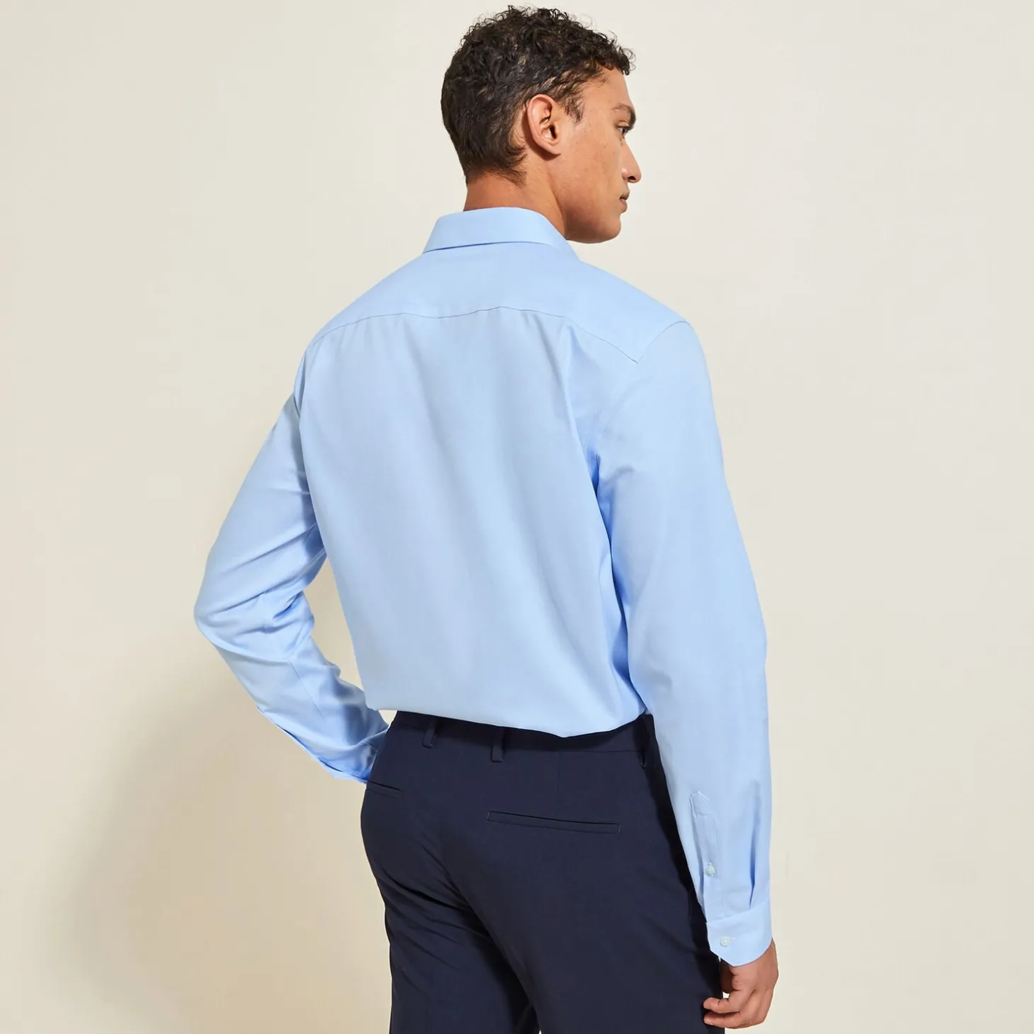 Om je hemden na het wassen niet te hoeven strijken, hebben we een stof ontwikkeld voorzien van een kreukvrije behandeling die strijken overbodig maakt.Het model meet 1m86 en draagt maat L.