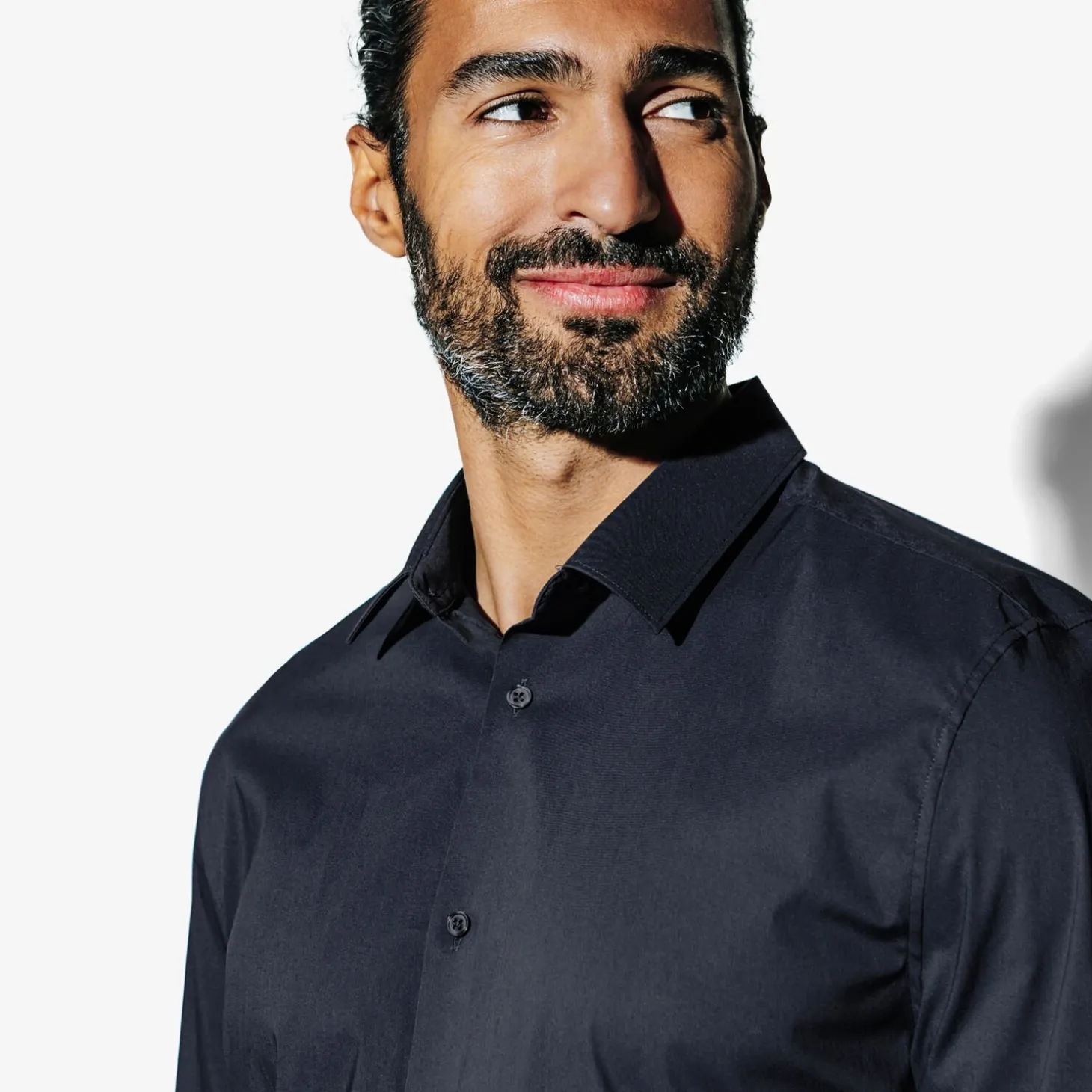 Dit hemd met lange mouwen past prima op een chino of kostuumbroek.