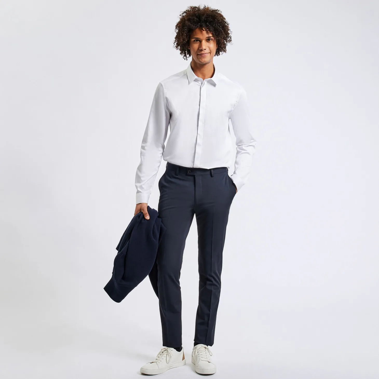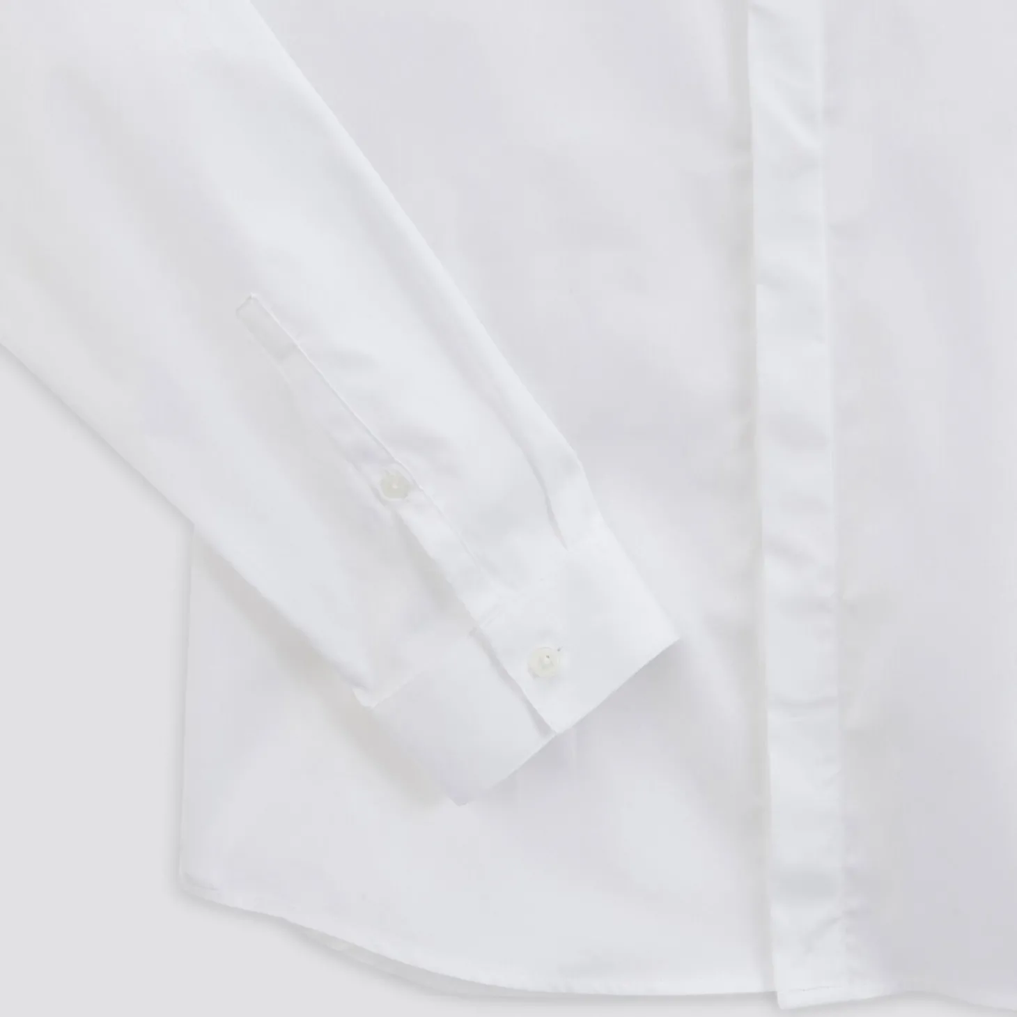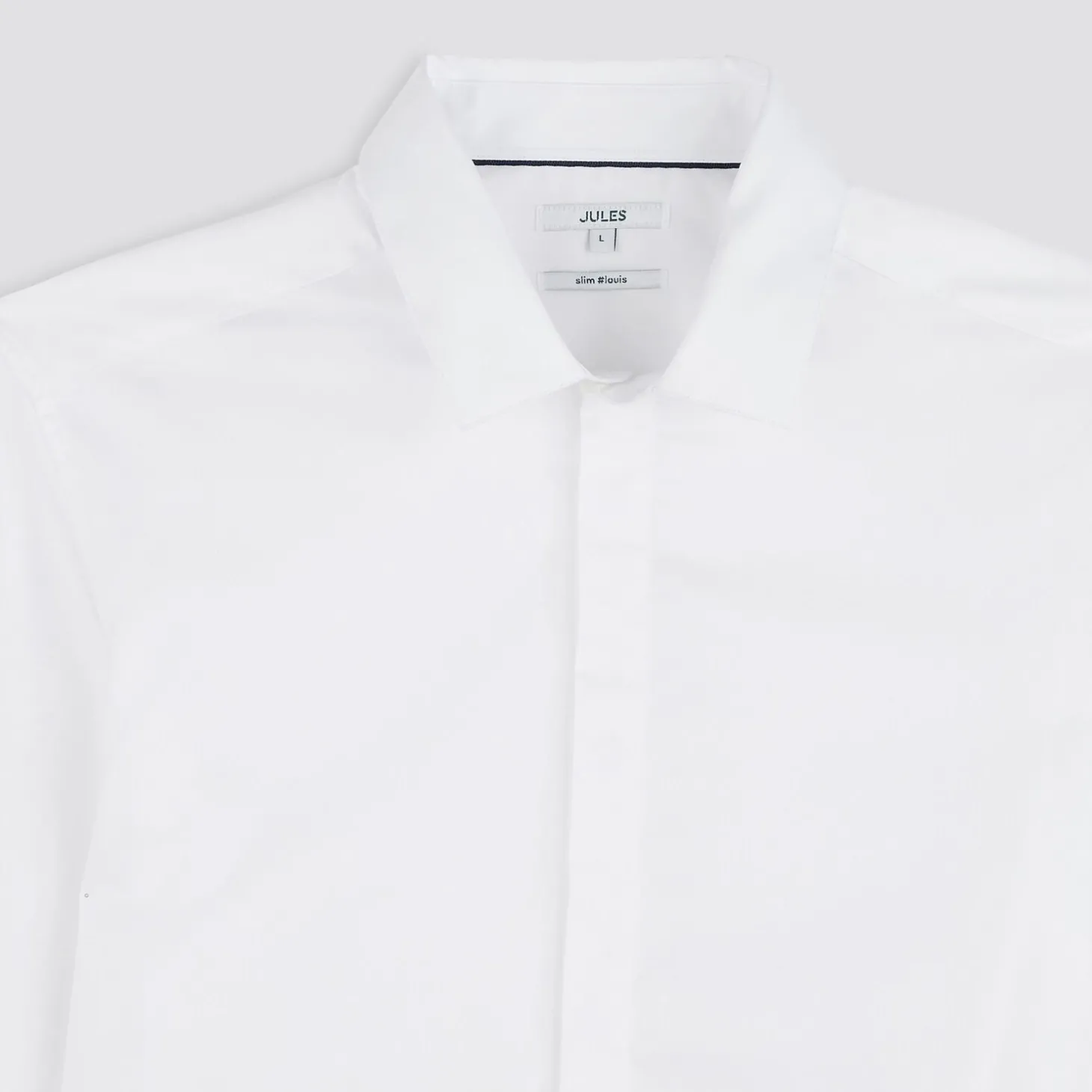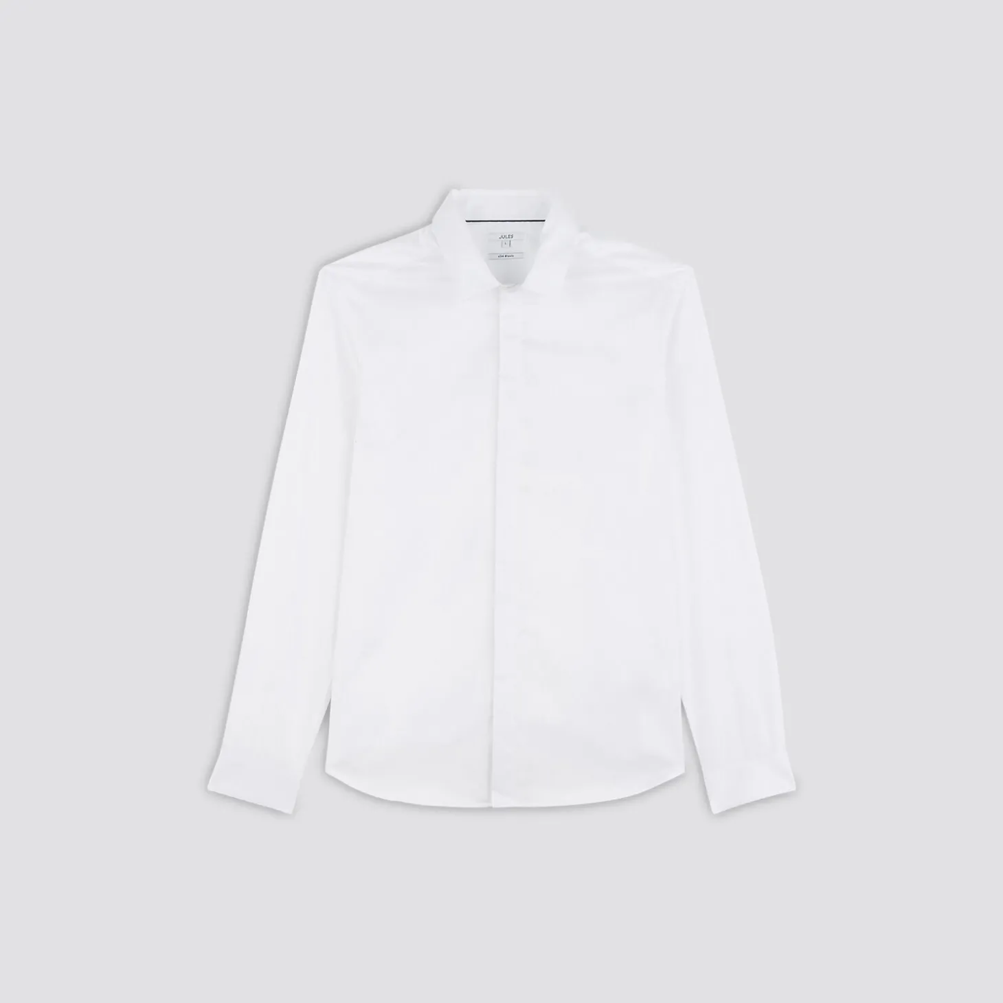 Dit effen hemd is uitgevoerd in satijnkatoen die de zachtheid van katoen combineert met de effen, gladde en glanzende textuur van de weving. Katoen, een natuurlijk vezel, is licht en ademend. Het heeft een blinde knooplijst, ideaal voor elegante gelegenheden.